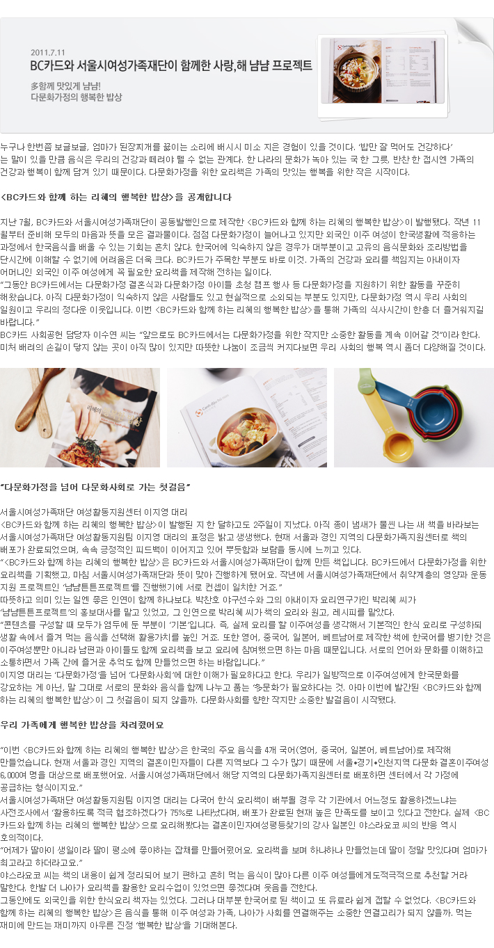 | 제목 | 사랑,해 냠냠 프로젝트 '리혜의 행복한 밥상' 출간 | 등록일 | 2011.07.11 |