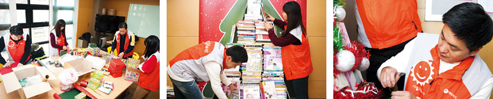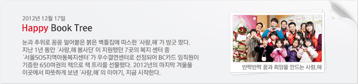 사랑을 품은 해 지난 2012년 12월 17일, 추운 겨울 날씨에 눈이 녹지않아 꽁꽁 얼어버린 ‘서울SOS지역아동복지센터’에 ‘사랑,해 봉사단’이 하나둘씩 도착했다. 지난 1년 동안 지원했던 7개의 아동복지센터 중 서울SOS지역아동복지센터가 우수결연센터로 선정되어 책 트리를 선물하기 위해 모인 것이다. 희망을 가득 담은 희망나무 "아이들이 볼 나무니까 최대한 예쁘게 부탁드려요!"라는 위트 있는 지도 선생님의 말을 듣고 본인이 갖고 있는 최대한의 미적 감각을 발휘하기로 한 봉사단원들. 곧바로 두 팀으로 나눠 한 팀은 과자 선물 포장을, 한 팀은 책 트리를 꾸미기로 했다. BC카드 임직원이 기증한 도서들로 꾸며진 책 트리는 가맹점정보개발팀 최강민 과장의 거침없는 지휘에 따라 정보기획팀 이덕영 과장, 정보시스템운영팀 김상범 대리, 대외협력팀 이은혜 사원이 일사불란하게 움직였다. 책으로 크리스마스트리를 만든다는 것이 생각보다 쉽지 않아 처음에는 고전했던 사랑,해 봉사단들. "이거 예쁜 트리가 되는 거 맞아?"라며 연신 고개를 갸웃거리더니, 이내 감을 잡은 이들은 순식간에 책을 쌓아 올리고 장식까지 마무리했다. Happy New Year, Happy Book Tree "우와, 트리다!" "선물 가져도 돼요?" "사슴이다!"라며 연신 웃음을 짓는 아이들이 귀엽게만 느껴졌다. 어떻게 만들어야 할지 막막했던 처음과 달리 멋지게 만들어진 트리가 아이들의 마음에 꼭 들어서 다행이다. 반짝거리는 트리가 보기 좋은지 트리 근처에서 방방 뛰는 아이들. 그러나 이내 다음 스케줄인 서점 나들이와 영화 관람에 더욱 관심을 보이며 소리를 지른다. 모두가 들뜬 마음으로 다음 장소로 이동하기 위해 신발을 신고 있는데, 한 꼬마 아가씨가 오랫동안 트리를 쳐다보았다. "아저씨, 저도 이 나무처럼 반짝반짝한 사람이 될게요! 고맙습니다!" 찬바람이 부는 추운 겨울이지만, ‘사랑,해 봉사단’은 따뜻함을 안고 출발했다.