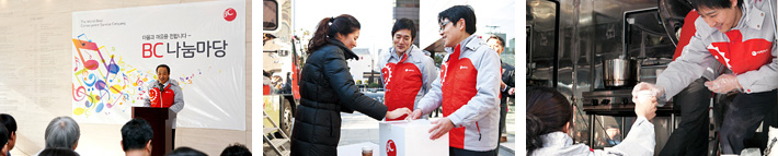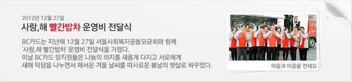 BC카드와 빨간밥차의 나눔 행진 2012년이 골인점을 향해가는 12월 27일, BC카드 본사 1층 로비에서는 ‘사랑,해 빨간밥차’ 운영비 전달식이 개최되었다. BC카드 이강태 사장은 "가슴 뿌듯한 행사를 개최하게 되어 기쁘다"며 서울사회복지공동모금회와 12개 빨간밥차 운영기관에 대한 감사의 인사를 전했다. 이에 서울사회복지공동모금회 이연배 회장은 "꾸준히 나눔을 실천하는 BC카드의 노력 덕분에 저소득층에게 따뜻한 한끼를 지속적으로 제공할 수 있게 되었다"며 사회에 따뜻한 나눔이 멀리 퍼지기를 기원했다. 사랑해요, 빨간밥차 BC카드와 빨간밥차의 인연은 길고도 깊다. BC카드는 2005년 사회공헌캠페인 ‘빨간사과 희망만들기’의 일환으로 ‘사랑과 희망의 빨간밥차’ 사업을 시작했다. 빨간밥차는 BC카드가 독거노인, 노숙인 등 소외된 이웃들의 결식문제 해결과 국가재난재해 발생 시 이재민 지원을 위해 특별 제작한 이동식 급식 차량이다. 따뜻한 사랑과 희망이 떠오르는 산뜻한 외장과 대규모 취사장비 및 냉장시설 등의 특장은 보기만해도 탄사를 지르게 한다. BC카드의 신나는 나눔 빨간밥차 운영비 전달식을 마치고 본사 1층 로비에서 ‘BC나눔마당’이 열렸다. 2회째를 맞이하는 ‘BC나눔마당’은 임직원들이 점심식사를 함께하고 로비에 마련된 기부함에 기부도 할 수 있어 따뜻한 겨울을 보내는 조직활성화 프로그램이다. 이날 모금된 기부금은 회사도 모금된 동일금액만큼 기금을 적립해 사회공헌적립 기금으로 사용할 예정이다. 또한 임직원들의 피아노 연주와 노래를 들으며 즐겁게 이야기를 나누고 식사할 수 있는 시간도 마련되어 있어 참여한 임직원들의 호응도가 높다.