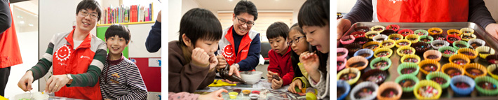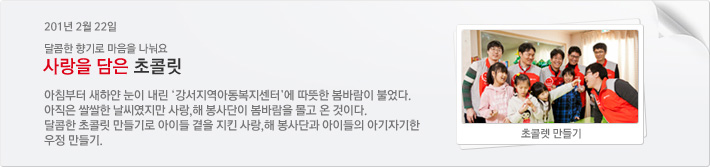 Sweet Chocolate! 입춘이 지났지만, 여전히 추운 날씨가 이어졌던 2월 22일. 강서지역아동복지센터의 앞마당에는 흰 눈이 소복이 쌓였다. 뽀드득거리는 마당을 가로질러가 아이들의 쉼터인 공부방에 도착한 사랑,해 봉사단은 넓고, 아늑한 공간이 꽤 마음에 들었다. 밸런타인데이는 이미 지났지만,새 학기가 시작되기 전 아이들에게 달콤한 추억을 선사해주고 싶었던 6명의 훈남 봉사단원들. 신사업개발팀 유재환 차장, 듀얼브랜드팀 손호진 과장, 정보개발지원팀 김명일 과장과 송동민 과장, 고객관리팀 최종일 주임, 회원정보개발팀 김영호 대리는 도착하자마자 누가 먼저 랄 것도 없이 옷을 벗고, 손을 씻은 뒤 초콜릿 만들 준비를 했다. 4개의 조로 저학년 테이블에는 한 명씩, 고학년 테이블에는 두 명씩 나뉘어 앉았다. 처음 본 봉사단이 낯설었는지 아이들은 수줍게 웃기도 하고,크게 인사하며 꺄르르 웃기도 했다. 으라차차 초콜릿 만들기 "아! 어떡해!" 어디선가 실망감 어린 소리가 들렸다. 그러더니 잠시 뒤에는 "야, 쏟으면 어떡해. 다 묻었잖아!"라는 높은 톤의 목소리도 이어졌다. 뜨거운 물에 중탕한 초콜릿을 사랑,해 봉사단이 종이 받침과 모양 틀에 채우면 그 위를 아이들이 각종 도구로 예쁘게 꾸몄다. 하지만 마음이 급한 아이들은 종이 받침과 모양 틀에 초콜릿을 붓자마자 손으로 덥석 잡아 떨어뜨리거나 손이나 옷에 초콜릿을 가득 묻혀 외마디 비명이 간간이 들려오는 것이다. 콩 한쪽도 나눠요 재미있는 초콜릿 만들기 시간이 끝나고 쌀쌀한 야외에서 초콜릿이 굳어질 동안, 아이들의 간식 시간이 시작됐다. 메뉴는 딸기샐러드. 상큼한 딸기 향이 공부방 전체를 휘감았을 때, 아이들의 장기 자랑이 시작됐다. 강서지역아동복지센터에서 배운 노래부터 아이들의 소소한 이야기까지 이어졌다. 송동민 과장은 "항상 느끼는 것인데 봉사하기 위해 시간을 할애하는 것에 비해 아이들에게 많은 것을 해주지 못하고, 오히려 제가 더 많이 받는 느낌입니다."라며 너털웃음을 보이기도 했다.