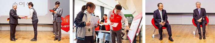 이어 이강태 사장은 경영자로서의 마인드를 접목시켜 학생들에게 위기 극복의 지혜를 전달했다. "위기는 언제든지 오게 되어있습니다. 하지만 위기란 왔을 때 극복하는 것이 아닌, 오기 전을 대비하는 것입니다. 물론 위기를 극복하는 방법이 있지만, 아주 어렵습니다. 위기가 오기 전 마지막 기회가 오는데요. 이때 최선을 다해 위기가 오지 않게 막아야 합니다." 주옥 같은 대화들이 오고 가는 동안 이를 경청하는 학생들의 눈은 더욱 초롱초롱해졌다. 수업을 마치고 지친 몸을 이끌고 오후 5시까지 행사가 열리는 광화문 올레 스퀘어를 찾아온 학생들. 힘들기도 하겠지만 장학생으로서 어떤 활동을 해야 하고, 어디에서도 들을 수 없는 사회 명사들의 솔직담백한 이야기를 들을 수 있어서 좋았다는 학생들. 메시지월 앞에서 포즈를 취한 학생들은 간단히 참여 소감을 밝혔다. "좋은 말씀들을 많이 들을 수 있어서 좋았어요. 저도 제 꿈을 다시 점검해보고 꼭 꿈을 이룰 수 있도록 노력하는 사람이 되어야겠습니다. 우리들의 꿈을 응원해주셔서 감사해요." 인디밴드 소란의 어쿠스틱 공연을 끝으로 ´사랑,해 스쿨천사 토크 콘서트´는 막을 내렸다. 학생들의 꿈이 무럭무럭 커가는 소리가 더 크게 들리는 듯했다. "우리의 미래는 우리 스스로 개척해나갈 거예요." - 선린인터넷고등학교 3학년 김남경 미니인터뷰 - 선린인터넷고등학교 2학년 이진형 미니인터뷰