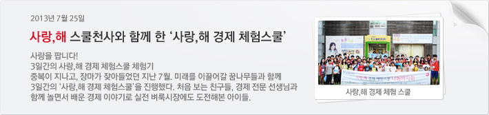 | 제목 | 사랑,해 스쿨천사와 함께 한 사랑,해 경제체험스쿨 | 등록일 | 2013.07.25 |