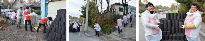들고 있는 연탄이 무거울 법도 한데 서로 얼굴에 연탄을 묻히며 장난을 치기도 하고 옛날 이야기를 하며 연신 웃으며 연탄을 나르던 사랑,해 봉사단.