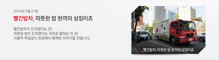 | 제목 | 빨간밥차, 따뜻한 밥 한끼의 상징이죠. | 등록일 | 2014.05.21 |