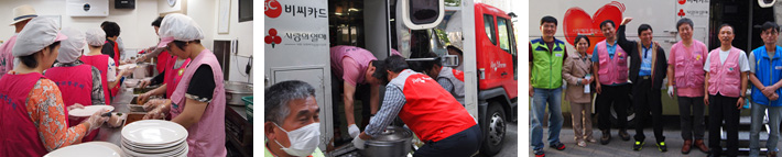 빨간밥차 들어옵니다~~ 서울역 따스한 채움터에서 매주 수요일 석식을 제공하고 있는 원봉공회를 방문했다. 밥이 식기 전에, 배식해드려야죠~ 30여명의 배식 봉사자 분들과 10여명의 현장 진행 봉사자 분들이 함께 하는 현장. 무료배식은 단순한 한 끼가 아니에요~ 배식을 마무리 하면 먼지 하나 남김없이 주변을 청소한다. B씨의 Mini interview 가맹점마케팅 2팀 최연석 차창 빨간밥차와 함께한 서울역 무료급식 봉사활동! 이 곳을 찾는 분들에게 작은 힘이 된다면 앞으로도 자주 참가하도록 할 것 입니다. 홍보팀 김하나 사원 빨간밥차로 한 끼를 전하는 무료급식현장! 밥을 짓는 봉사자, 배식을 담당하는 봉사자, 그릇을 정리하는 봉사자, 자리를 안내하는 봉사자 모두 한 마음으로 임했던 현장에서 많은 것을 보고 느꼈습니다.