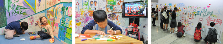 서울국제핸드메이드페어2014 9월 17일부터 20일까지 4일간 진행된 서울국제핸드메이드페어 2014는 우리집에 놀러와! 서울국제핸드메이드페어2014에 사방이 흰 벽으로 둘러싸인 창작부스, 감동, 웃음, 행복 흰 벽이 알록달록 그림들로 채워졌다.