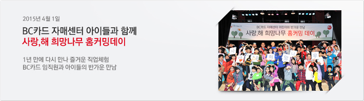 | 제목 | BC카드 자매센터 아이들과 함께 사랑,해 희망나무 홈커밍 | 등록일 | 2015.04.01 |