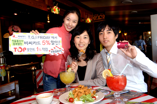 TGI에서 할인도 받고 포인트도 적립 받으세요 ※ 비씨카드, 10월부터 12월까지 TGI 5% 할인 및 TOP포인트 1% 적립 비씨카드는 10월부터 12월까지 3개월 동안 TGI 프라이데이를 이용하는 모든 고객을 대상으로 결제금액의 5%를 현장 할인해 준다. 이와 함께 2006년 9월까지는 결제금액의 1%를 TOP포인트로 적립해 준다. 적립된 TOP포인트는 TGI를 포함, 약 10만개의 TOP가맹점에서 현금처럼 사용할 수 있다.