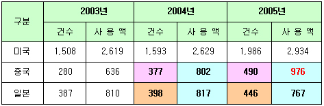 - 최근 3개년 해외 사용액 최다 3개국 현황 (단위 : 천건, 억원)  주) 비씨카드 11개 회원은행 회원이 해당 국가에서 비씨카드로 사용한 액수와 건수임