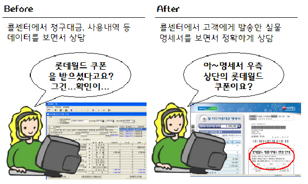 비씨카드(대표이사 사장 장형덕 www.bccard.com )는 한국후지제록스(대표 정광은)와 함께 고객 개인정보의 보안강화 및 고객 커뮤니케이션 강화를 위한 ‘명세서 통합관리 서비스’ 의 구축을 완료했다고 22일 밝혔다. 비씨카드는 이번 명세서 통합관리 서비스 구축을 통해 국내 최초로 명세서 출력 및 발송 업무를 제외한 전 공정을 비씨사가 직접 수행할 수 있는 시스템을 갖추게 되었다. 예전에는 고객에 대한 이용대금청구 data를 명세서 제작 및 발송업체에 전달하였으나 이제는 바로 출력이 가능한 data만 전송함으로 개인정보의 보안성이 한층 강화되었다. 또한 현재 카드 업계 콜센타의 고객 대응은 단순 카드사용 내역 조회에서 벗어나 카드명세서와 함께 제공되는 마케팅 정보 제공 및 확인도 중요한 상담업무이나 콜센터에서는 CRM을 통한 고객별 명세서의 마케팅 자료를 일일히 찾아서 상담을 했기 때문에 고객 대응 시간이 소요되어 불만 사항으로 지적되어 왔었다. 하지만 이번 구축된 통합관리 시스템으로 고객에게 보내지는 문서출력 data를 “Archiving(파일보관)” 기술을 이용하여 전자 문서로 만들어 콜센터에 지원함으로써 콜센터의 상담 모니터를 통해 고객이 받은 명세서와 명세서에 포함된 각종 마케팅 정보를 실물 명세서처럼 동일하게 볼 수 있기 때문에 고객 대응 업무의 신속성 및 고객과의 커뮤니케이션의 효율성을 가져올 수 있게 되었다.