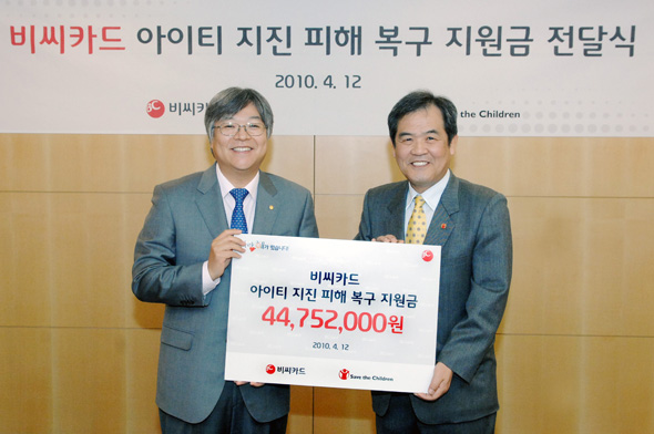 사진설명) 비씨카드 이강혁 부사장(좌측)은 12일(월) 비씨카드 본사에서 세이브더칠드런의 김노보 회장이 참석한 가운데 ‘아이티 지진피해 복구 지원금’ 44,752,000원 전달하는 행사를 가졌다 비씨카드(대표이사 사장 장형덕)는 12일 오전 서초동 비씨카드 본사에서 비씨카드 이강혁 부사장, 세이브더칠드런(www.sc.or.kr) 김노보 회장이 참석한 가운데‘아이티 난민 돕기 TOP기부 캠페인’의 모금액 전달식을 가졌다고 밝혔다. 비씨카드는 최악의 지진에 피해를 입은 아이티 재해민을 돕기 위해 지난 1월 21일부터 3월 31일까지 홈페이지를 통해‘아이티 난민 돕기 TOP기부 캠페인’을 진행했다, 캠페인 기간 동안 총4,470건의 TOP기부(1TOP=1원)가 이루어져 22,376,000원의 성금이 모였으며, 비씨카드는 고객이 기부한 TOP과 동일한 금액을‘매칭그랜트 방식’으로 후원하여 총 44,752,000원이 모금되었다. 한편 비씨카드가‘아이티 난민 돕기 TOP기부 캠페인’기부 행태를 분석한 결과 ◀ 아이티 난민 돕기 TOP기부는 모금 기관인 세이브더칠드런을 통해 지난해 1년 동안 모금된 전체 TOP기부액 29,099,000원의 4/5에 해당하는 기금이 모금된 것으로 나타나 참여율이 매우 높았던 것으로 나타났다. ◀ 또한 아이티 난민 돕기 TOP기부는 일 평균 66회, 건당 금액은 5,006원으로 나타나 비씨카드 홈페이지를 통해 2009년 1년간 진행됐던 전체 TOP기부 건당 금액 4,536원, 일 평균 50회의 기부가 진행된 것과 비교했을 때 아이티 난민 돕기 TOP기부 금액과 횟수 모두 높았다. ◀ 포인트 기부가 상대적으로 적게 발생하는 기간인 2~3월에 아이티 난민 돕기 TOP기부 캠페인이 진행되었지만 작년 대비 일 평균 기부액이 10만원 이상 많아졌다. 아이티 난민돕기 TOP기부가 진행된 2010년 1~3월 일 평균 모금액은 329,058원이었고, 2009년 일 평균 TOP 기부 금액은 228,397원이었다. 아이티 난민돕기 캠페인은 기부 시즌과 관계없이 많은 참여가 이루어졌다는 것을 알 수 있다. ◀ 이번 아이티 모금 결과 젊은 연령층의 참여가 높게 나타났다. 2009년 한 해 동안 비씨카드에서 모금된 TOP기부 전체 모금액 83,361,000원에서 20대 고객의 기부액이 차지하던 비율이 9.6%이었던 반면 아이티 TOP기부에서 20대가 기부한 금액이 12.4%를 차지하여 다른 연령대에 비해 증가율이 가장 높게 나타났다. 표> 연령대별 포인트 기부금액 점유율
