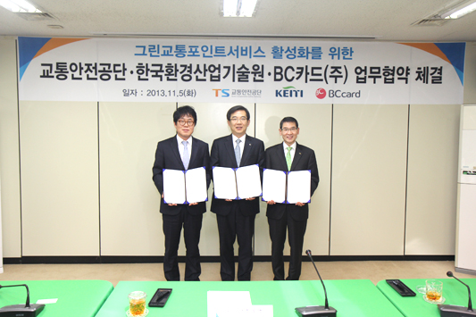2,700만 고객과 함께 하는 BC카드(대표이사 사장 이강태, www.bccard.com)는 그린교통포인트서비스의 활성화를 위해 한국환경산업기술원, 교통안전공단과 MOU를 체결했다고 5일 밝혔다. 그린교통포인트서비스란 도보, 자전거 등 친환경교통수단 이용문화를 조성하여 온실가스 배출을 최소화 하도록 국토해양부에서 운영하고 있는 친환경 서비스이다. 11월 5일, 경기도 교통안전공단 본사에서 진행된 이날 협약식에는 BC카드 김수화 본부장, 한국환경산업기술원 윤승준 원장, 교통안전공단 정일영 이사장 및 관계자들이 참석한 가운데 그린교통포인트서비스 활성화를 위한 MOU를 체결하였다. 이날 협약식에서 BC카드 김수화 본부장은 "BC카드에서 운영 중인 그린카드와 그린교통포인트서비스를 연동한 시스템∙전용망 구축을 통해 700만 그린카드 회원에게 친환경생활에 대한 새로운 인센티브를 제공하고, 국가 차원의 온실가스 감축에 조금이나마 기여할 수 있게 되어 기쁘게 생각한다"면서 "향후 BC카드는 한국환경산업기술원과 적극 협력하여 그린카드의 혜택을 더욱 강화해 나감으로써 그린카드를 세계적인 친환경 아이콘으로 만들도록 적극 노력하겠다"라고 밝혔다. 한편 그린카드는 전 국민의 친환경 생활 실천을 위해 환경부와 BC카드가 2011.7월 출시한 카드이며, 그린교통포인트서비스를 통해 제공되는 에코머니 포인트는 BC 그린카드 회원 및 에코머니 회원이면 누구나 적립/사용할 수 있다. 이 서비스는 애플리케이션을 활용하여 도보, 자전거를 이용하는 그린카드 회원들의 이동거리를 측정하여 포인트를 적립해주는 서비스로 1km당 각각 20포인트(도보)와 6포인트(자전거)씩, 월 최대 5천 포인트까지 적립 받을 수 있다. |