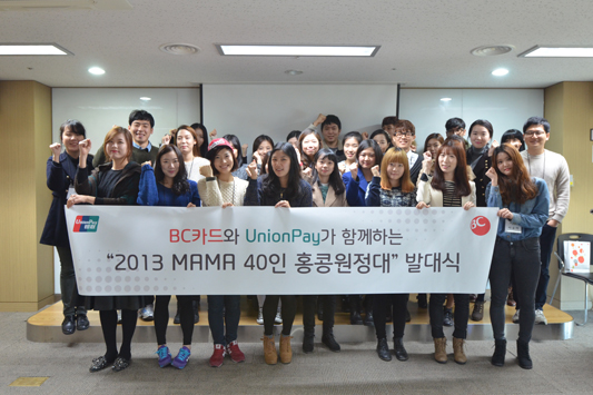 2013 MAMA 보러 홍콩 다녀올게요, 느낌 아니까~ BC카드, 2013 MAMA 40인 원정대 발대식 가져 - 지난 11월 3일까지 총 700여명이 지원서 제출, 서류심사 및 면접 등을 거쳐 최종 40인 선정 - 2013 MAMA 행사 관람, 홍콩 현지에서 BC-UnioPay 카드 사용 등 다양한 체험 프로그램 진행 예정 2,700만 고객과 함께 하는 BC카드(대표이사 사장 이강태, www.bccard.com)는 홍콩 현지에서 진행되는 2013 MAMA 행사의 참여기회를 제공하는 "2013 MAMA 40인 원정대" 발대식을 가졌다고 18일 밝혔다. CJ E&M에서 주최하는 MAMA(Mnet Asian Music Awards) 행사는 전세계 93개국의 주요 네트워크를 통해 방영되고 온라인 투표를 통해 일반인들이 간접적으로 시상에 참여할 수 있는 세계적인 행사로, BC카드와 유니온페이 인터네셔널이 함께 Title Sponsor로 참여해 후원하고 있다. 지난 16일, 서초동 소재 BC카드 사옥에서 진행된 "2013 MAMA 40인 원정대" 발대식에는 원정대로 선정된 BC카드 회원 40명을 비롯하여 BC카드 관계자, CJ E&M 관계자 등이 참석한 가운데 진행되었다. "2013 MAMA 40인 원정대"로 선정된 BC카드 회원들은 11월 22일 홍콩에서 진행되는 2013 MAMA 행사 관람을 비롯하여, 홍콩 현지에서 BC-UnionPay 카드를 사용하는 등 다양한 체험 프로그램에 참여하게 될 예정이다. 이날 원정대로 뽑힌 윤영재씨는 "다양한 이벤트들과 정보들이 공유되어 있는 BC카드 페이스북을 자주 방문하던 중에 이번 이벤트를 보고 신청하게 되었다"면서, "평소에 자주 사용하던 BC카드와 함께 홍콩에서 좋은 추억들을 쌓을 수 있게 되어 매우 기대된다"고 밝혔다. 한편 이번 행사를 기념하기 위해 2013 MAMA 공식 로고가 삽입된 선불카드가 출시/판매 중에 있으며, 이 상품 이용 시에는 2014년 2월 28일까지 △ 홍콩 공항철도 5% 할인 △ 인천공항 내 33개 F&B매장 최대 15% 할인 등과 같은 혜택을 추가로 받을 수 있다. |
