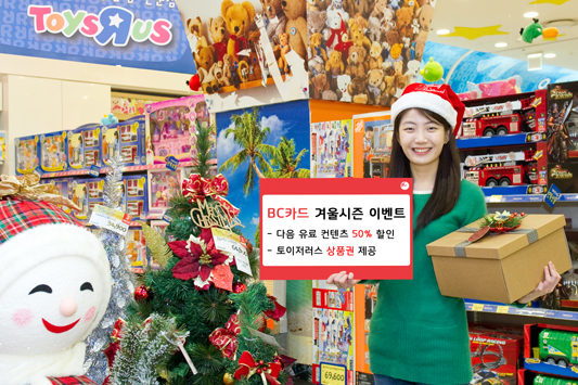 BC카드, 겨울시즌 이벤트 진행 - 세계적인 완구 체인점 토이저러스에서 BC카드로 결제 시, 5천원 할인권/상품권 제공 - 12월 한달 동안, 매주 추첨을 통해 총 3,400명의 고객에게 다양한 경품 제공 - 12월 27일까지 Daum 컨텐츠(뮤직, 웹툰, 영화, 소설 등) 구매 시 50% 청구할인혜택 - 2014년 스키장 폐장일까지 전국 10여개 스키장에서 최대 60% 할인혜택