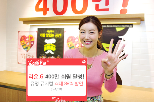 | 제목 | BC카드 「라운.G」 400만 회원 달성, 뮤지컬 최대 88%할인 | 등록일 | 2014.04.15 |