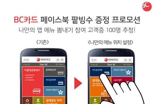 BC카드 앱 ‘메뉴 위치 설정’ 기능을 활용한 [나만의 앱 메뉴 뽐내기] 이벤트에 참여하세요 - 나만의 앱 메뉴 배치를 디자인해 BC카드 페이스북에 캡처해서 올린 참여자 중 100명을 추첨해 카페베네 팥빙수 모바일 쿠폰 제공 - 향후 고객 관점에서 발상하고, 고객 중심의 편의성을 제공하는 서비스를 지속 개발 계획 BC카드(대표이사 사장 서준희)는 앱 활성화의 일환으로 오는 11일까지 기업 공식페이스북(www.facebook.com/thebccard)에서 팥빙수 모바일 쿠폰을 제공하는 ‘나만의 앱 메뉴 뽐내기’ 참여형 이벤트를 실시한다. 이 프로모션은 총 22개 서비스 메뉴가 모자이크 형태로 배열된 BC카드 앱의 ‘메뉴 위치 설정’ 기능을 기반으로 진행된다. 이 기능은 사용자가 BC카드 앱 메뉴들을 손가락으로 위치 이동시키거나 삭제 가능하며, 고객 편의성 제고 목적으로 2013년 7월 개발되어 운영 중이다. 여타 카드사 앱들이 ‘카드승인내역’, ’이용대금명세서’ 등 평균적으로 가장 많이 사용되는 서비스 메뉴 순으로 고정 배열되는 반면, BC카드 앱은 메뉴들의 이동 배치가 자유롭다. 고객 편의적인 이 기능을 통해 근처 혜택 가맹점이 궁금한 회원은 ‘내 주변 가맹점’ 메뉴를, 보유카드별 실적이 궁금한 회원은 ‘실적충족현황’ 메뉴를 최상단에 위치 이동시키는 식으로 자신의 사용 형태에 맞춰 배열할 수 있다. 이러한 장점을 십분 활용하여 시행되는 ‘나만의 앱 메뉴 뽐내기’ 이벤트는 BC카드 앱 내 서비스 메뉴들을 자신이 원하는 대로 배치한 후, 이를 캡처 받아 BC카드 페이스북에 올리면 참여 가능하다. 100명을 추첨하여 카페베네에서 사용 가능한 팥빙수 모바일 쿠폰(8,900원 상당)을 제공할 예정이다. BC카드는 앞선 1주일 동안 기업 페이스북에서 [BC카드 앱 셀프디자인 이벤트 - 퍼즐을 맞춰라]라는 ‘메뉴 위치 설정’ 기능을 활용한 이벤트를 진행한 바 있으며 총 4,184건 좋아요, 댓글 및 공유 등의 관심을 끌기도 했다. BC카드 마케팅부문장 원효성 부사장은 “단 하나의 서비스를 제공하더라도 고객들이 편리하게 사용할 수 있어야 한다”면서 “앞으로도 고객 관점으로 발상하고, 고객 중심의 편리한 서비스를 제공할 수 있도록 최선을 다하겠다"라고 밝혔다. <보도자료 이미지> BC카드 앱의 ‘메뉴 위치 설정 기능(메뉴를 위치 이동시키거나 삭제 가능한 기능)을 기반으로 BC페이스북에서 시행되는 ‘나만의 앱 메뉴 뽐내기’ 이벤트가 진행 중임