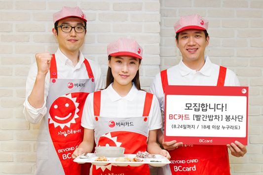 BC카드는 2005년부터 이동식 5톤 급식 차량인 [사랑,해 빨간밥차]를 전국 9개 지역 사회복지기관 총 13대를 기증함. 지난 10년 간 독거노인, 노숙인 등 결식 소외 계층과 재난 재해 발생시 이재민 지원을 위해 연간 45만명에게 무료 급식을 제공해온 BC카드 대표 사회공헌 사업임 |