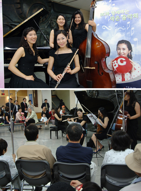 대표 연주자의 곡 설명을 시작으로 진행된 이날 연주는 관중들의 발걸음을 묶는데 많은 시간이 필요치 않았습니다. 처음에는 그냥 호기심으로 서있던 환자들이나 보호자분들이 이내 멈추어 음악감상에 빠져들었고 바쁘게 돌아다니던 의사, 간호사들도 아는 노래가 연주 될 때는 흥얼대면서 가던 발걸음을 멈추었습니다. 이날의 연주회는 다른 음악회에서는 볼 수 없었던 좀 독특한 공간에서 다양한 관객층을 대상으로 아주 자연스럽게 이루어졌습니다. 선곡은 널리 알려진 클래식음악과 영화, OST ,CF 등에 삽입되어 많은 사랑을 받은 곡을 재즈 리듬으로 편곡하여 흥겹게 감상할 수 있도록 했고 연주회 운영방식은 병원 업무에 방해가 되지 않는 범위내에서 최대한 형식을 탈피하고 자유롭게 진행될수 있도록 하였습니다. 약 1시간 가량 진행된 이날 연주회는 연주자의 곡 해설과 함께 환자 및 보호자, 그밖에 병원 관게자들이 같이 동참하며 시종일관 흥미롭고 자연스럽게 진행되었고 연주가 진행될수록 점차 열기는 고조 되었습니다. 다만, 뒤늦게 동참한 환자들은 뒤에서 서서 감상하거나 특히 늦게 합류한 휠체어를 탄 환자들은 다소 감상하는데 불편하여 영업부 직원들의 마음을 안타깝게 했습니다. 마침내 정해진 연주곡이 끝나자 앵콜이 이어져 관객이 신청한 영화 타이타닉의 주제곡인 "My heart will go on" 가 즉흥적으로 연주되었고 연주가 끝나자 그곳에 모인 관중들은 모두 기립박수까지 하는 등... 예상치 못한 환호에 영업부 직원들이나 병원관계자, 연주자들은 모두 가슴이 벅차오르는것을 느낄 수 있었습니다. 향후에도 영업부에서는 관할지역의 문화 활동에 적극적으로 발굴하여 참여함으로써 회사의 이미지 제고 및 고객충성도를 높이는데 최선을 다할 생각입니다. 이날 관객중 한분의 말이 생각납니다. "오랬만에 정말로 맛있는 식사를 한 기분입니다", 비씨카드 좋은일 많이들 하시네요, 아버님 병간호 때문에 정말 힘들었는데 정말 좋은 시간 이었습니다. 앞으로도 이런 연주회 자주 해주세요" |