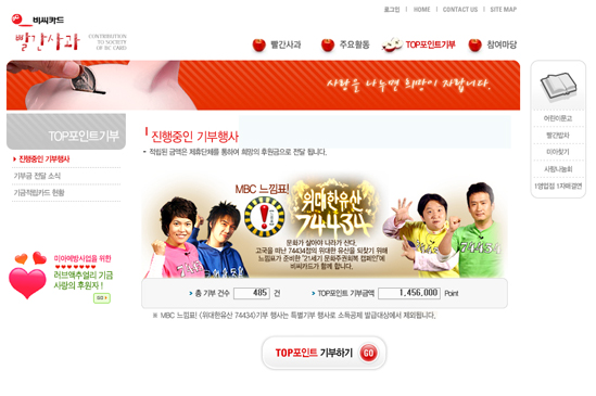 비씨카드는 보다 많은 포인트 기부의 유도를 위해 자사 홈페이지와 이용대금 명세서 등을 통해 적극 홍보키로 하고 MBC도 ‘위대한 유산’ 공식 카페인 다음카페 (http://cafe.daum.net/great74434) 를 통해 비씨 TOP포인트 기부를 널리 홍보할 계획이다. 비씨카드 박귀순 홍보팀장은 “최근 2년간 비씨카드 고객들이 기부한 TOP포인트로 20여명의 아동들의 심장병 수술을 성사시키는 등 십시일반(十匙一飯)으로 기부한 포인트가 모여 보람있고 놀라운 결과를 가져올 수 있다는 것을 많은 고객들이 알게 되었다” 면서 “문화재 환수기금 모금에도 고객님들의 적극적인 참여로 많은 포인트가 기부되어 소중한 우리 문화재를 되찾는데 기여할 수 있기를 바란다” 라고 말했다. 비씨카드는 신용카드 포인트의 기부가 우리사회의 모범적인 기부문화로 정착되고 고객들의 많은 참여가 가능하도록 포인트 기부처를 지속적으로 확대한다는 방침이다. 한편, MBC TV 느낌표! <위대한 유산 74434>는 매주 토요일 오후 5시 40분에 방송되어 해외에 유출된 우리의 문화재를 환수하는 운동을 벌여 국민적인 호응과 관심을 얻고 있는 인기프로그램으로 올 7월 조선왕조실록 오대산 사고본을 일본 도쿄대에서 환수하였고 진주대첩 김시민 장군 ‘공신교서’를 일본 고서점에서 국민모금액 1억 2천만원을 주고 매입하는 등의 성과를 거두었으며 현재는 ‘외규장각도서’를 프랑스로부터 환수하고자 하는 운동을 벌이고 있다. |