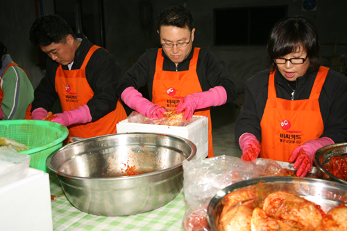 김장 담그기에 참여하고서... 비씨카드 기업 봉사활동을 선택할 때 유난히 눈에 띄었던 봉사활동이 장애 청소년과 함께 김장 담그기 였다. 봉사활동이 나름대로 힘도 들고 어렵겠지만 김장을 난생 처음 직접 담근다는 호기심과 장애우 청소년들과 공감대를 형성하는 봉사활동이 나에겐 매력적이었다. 특히 김장을 담근 후 보쌈 먹을 수도 있을 것 같은 기대감도 함께 ^^11월 21일 오후 2시에 “말죽거리”라 불리는 양재역에 내려 사회 종합 복지관에 도착하였다. 김장담그기에 20여명의 비씨 직원분들이 동참해 주셨고 복지관 사회복지사님과 인사를 나눈 다음 함께 김장을 담글 장애 청소년들에 대해 프리젠테이션 형식으로 소개를 받았다. 함께할 5명의 장애우들이 정상인과는 다른 언행과 성격을 가지고 있어 사전 정보를 주셔서 우리 직원들이 장애우들을 이해할 수 있는 많은 도움이 될 수 있었다. 김장 담그기에 본격적으로 일이 진행될 때는 각 3개조를 나눠 작업 공정이 이루어졌으며 특히 남자들은 무,배추 씻고 말리기 같은 힘이 필요한 일에 여자들은 채소 다듬기, 양념 만들기” 등 잔손이 필요한 일들에 배치되었다. 막상 일에 들어가니 날씨가 쌀쌀하여 찬물에 무,배추를 씻으면서 옷과 신발이 젖어 추웠고 쪼그리고 않아 좀 힘들었지만 두 분 상무님이 더 열심히 일하셔서 힘든 내색도 할 수가 없었다. 배추 양념 속을 버물면서 서로 입에다 김치 속을 배추에 쌓아 넣어줄 때는 화기애애한 가족적 분위기를 느낄 수 있었다. 장애우 친구들도 비씨인들과 함께 열심히 동참하여 260 포기 김장을 담그는데 4시간 정도 걸렸다. 김장을 다 마친 후 보쌈을 맛있게 먹으면서 김장 담그기에 보람을 느낄 수 있었다. 처음으로 기업 사회 봉사활동을 하면서 보람과 기쁨을 느낄 수 있었으며 다음에 기회가 된다면 다른 봉사활동에도 참여하고 싶었다. 타인과 나누며 주는 즐거움이 받는 즐거움보다 더 크다는 것을 느낄 수 있는 하루였다 <정보기술팀 유용호> |