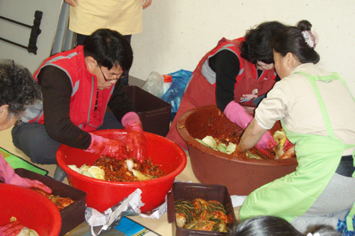 하였습니다. 김장 속을 넣으면서 맵다,짜다, 아니다,맞다등 의견도 분분했지만 좀더 맛있는 김치를 만들려는 정성은 모두 같았습니다. 배추 속을 넣어 완성된 김치가 용기에하나하나 차면서 어느덧 모든 김장이 마무리되었습니다.240L