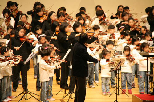 어느새 어린이들의 연주에 사라지고 없었습니다. 드디어 오늘 음악회의 하이라이트! 어린이 170여명과 사랑의 바이올린
