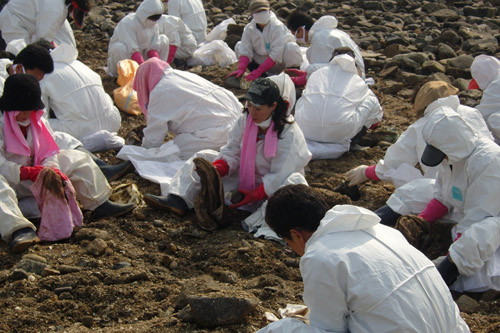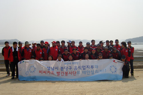 분당지점, 요식업중앙회와 태안 기름제거 작업 활동 펼쳐 지난 3월19일 분당지점 직원일동은요식업중앙회 분당지부 회원 약 50명과 함께 기름제거 작업을 돕기 위해충남 태안 개목항으로 출발하였다. 아직도 자원봉사 활동이 한참 진행 중인 태안의 현재 상황은문이 닫혀 있는 상가, 횟집 등이 즐비해 있고 곳곳에서 볼 수 있는 슬픔에 잠긴 어민들의 표정에서 그 피해의 심각성을 느낄 수 있었다. 오전10시경 현장에 도착하여 방제복과 마스크를 착용하고 악취와 기름으로 뒤엉킨 태안 갯벌에서의 기름제거 작업을 시작했다. 그동안 많은 자원봉사자 분들의 수고함 덕분으로 태안 기름유출 사고가초기 언론에 보도된 참담한 모습보다는 많이 깨끗해 보였으나, 굴삭기로 모래를 파자 곳곳에서나타나는 기름유출 사고의 흔적이 존재 하였으며 이를일일이 헌옷가지로 바위, 자갈에 붙어 있는 기름제거 작업을 진행했다. 작업을 마치고 분당구 요식업협회 회원들(가맹점 대표)과 분당지점 직원들은 태안의 참담한 피해상황을 직접 보고 느끼며 잠시나마 함께 할 수 있었던 것에 대해 감사하게 생각하며, 예전의 아름다운 태안의 모습을 되찾기를 간절히 바라며 버스에 올랐다. <글 / 사진 : 분당지점 > |