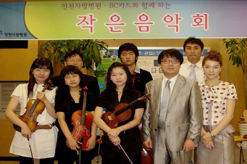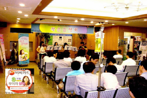 인천지점, "비씨 작은 음악회" 개최 - 환자,보호자 및 병원 관계자들 시종일관 자리 지키며 호응- 연주자와 관객이 한테 어우러져 성황리에 마쳐... 지난 6월 25일(수) 인천지점은 당사 전략가맹점인 인천사랑병원 2층 로비에서 감성마케팅의 일환으로 "비씨 작은 음악회"를 개최하였다. 6월1일부터 30일까지 무이자 3개월 행사 기간 중 같이 행사를 실시함으로써 전략가맹점 매출액 증대 및 당사 브랜드 이미지 강화를 동시에 실현시키기 위한 행사였다. 또한 인천 예술고등학교 출신 대학생들로 구성된 연주팀을 섭외하여 연주를 하게함으로써 당사,병원,학생들 모두 지역사회를 위한 봉사 활동을 한다는 데 의미를 더하고자 하였다. 다소 무더웠던 늦은 봄날 인천 사랑병원 2층은 평소 때와 같이 병원 의사.간호사 ,직원,대내외 환자 및 보호자들이 바쁜 걸음으로 매우 분주하였다. 잠시 공연 준비를 마치고 오후 12시 30분부터 인천예고 출신 대학생들로 구성된 현악 4중주(바이올린 1,바이올린2, 비올라, 첼로)의 연주가 시작 되자, 처음에는 그냥 호기심으로 서있던 환자들이나 보호자분들이 이내 한 장소에서 음악감상에 심취해 있었고 바쁘게 돌아다니던 의사 간호사들도 아는 노래가 연주 될 때는 흥얼대면서 잠시 발걸음을 멈추기도 했다. 선곡은 널리 알려진 클래식음악과 영화, OST ,CF등에 삽입되어 많은 사랑을 받은 곡을 재즈리듬으로 편곡하여 흥겹게 감상할 수 있도록 했고 연주회 운영방식은 병원 업무에 방해가되지 않는 범위 내에서 최대한 형식을 탈피하고 자유롭게 진행하기로 결정 했다. 약 1시간 가량 진행된 이 날의 연주회는 연주가 진행될수록 점차 열기는 고조 되었고 뒤늦게 동참한 환자들은 뒤에서 서서 감상하거나 특히 늦게 합류한 휠체어를 탄 환자들은 다소 감상하는데 불편하여 진행자들의 마음을 안타깝게 했다. 마침내 정해진 연주곡이 끝나자 앵콜이 이어졌고 이에 연주자들이 앵콜 송을 연주하기 시작하였다. 하지만 이때 조그마한 일이 일어났다. 너무 열심히 연주한 나머지 첼로의 줄이 끊어지는 사건이 발생한 것이다. 그러나 계속해서 한동안 계속연주를 하는 모습에 모인 관객들은 연주자들에게 아낌없는 박수를 보내 주었다. 비록 더 이상 많은 앵콜곡을 연주하지는 못하였지만 연주자나 관람객이나 행사 관련자들 모두 뿌듯함을 느낀 행사였다. <글/사진 인천지점> |