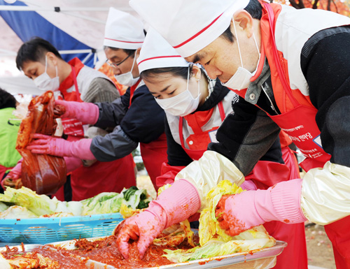 비씨카드 사랑,해 봉사단 김장 나눔 한마당 BC카드는 채소가격 폭등과 일손 부족으로 겨울철 대비 김장 준비에 어려움을 겪는 저소득층 가정을 돕기 위해 ‘BC카드와 서초구재가복지실무자연합회가 함께하는 사랑,해 김장 나눔 한마당’을 열었습니다. 이번 김장 나눔 행사는 12일 서초구 양재동 소재의 서초구민회관에서 진행되었으며 BC카드 이강혁 부사장, 한나라당 이혜훈 국회의원, 진익철 서초구청장, BC카드 임직원으로 구성된 ‘사랑,해 봉사단’100명, 연합회 소속 복지기관 및 서울사회복지공동모금회 임직원들이 참석하였습니다. 이날 ‘BC카드 사랑,해 봉사단’은 오전 9시30분부터 오후3시30분까지 6시간 동안 행사 진행을 위한 사전준비, 재료 손질, 김장 담그기, 포장 및 적재 등 김장 담그기를 위한 모든 과정에 직접 참여하였고, 서초구 거주 저소득가정 650가구를 지원하기 위해 약 2,200포기(4,513Kg) 김장을 담갔습니다. |