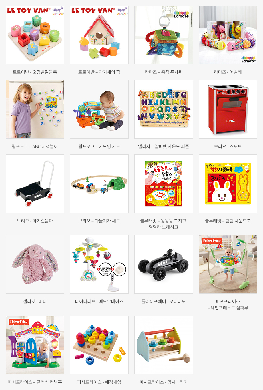 트로이반-오감발달블록, 트로이반–아기새의 집, 라마즈–촉각 주사위, 라마즈-애벌레, 립프로그–ABC 자석놀이, 립프로그–가드닝 카트, 멜리사–알파벳 사운드 퍼즐, 브리오-스토브, 브리오-아기걸음마, 브리오–화물기차 세트, 블루래빗–동동동 북치고 랄랄라 노래하고, 블루래빗–쵬쵬 사운드북, 젤리켓-버니, 타이니러브-메도우데이즈, 플레이포에버-로레티노, 피셔프라이스–레인포레스트 점퍼루, 피셔프라이스–클래식 러닝홈, 피셔프라이스-페깅게임, 피셔프라이스-망치때리기