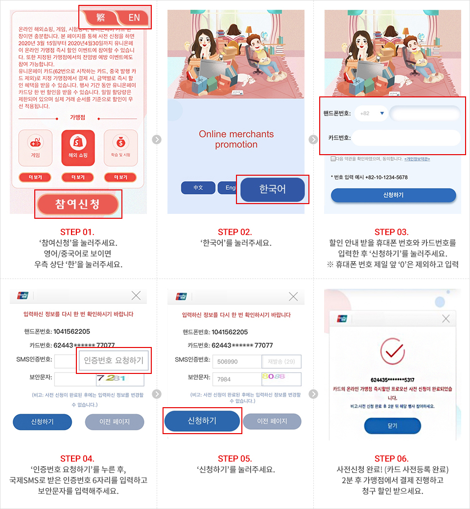 - 본 혜택은 사전 신청 채널을 통해 유니온페이 카드 1장당 1인 5회 신청으로 제한됩니다.