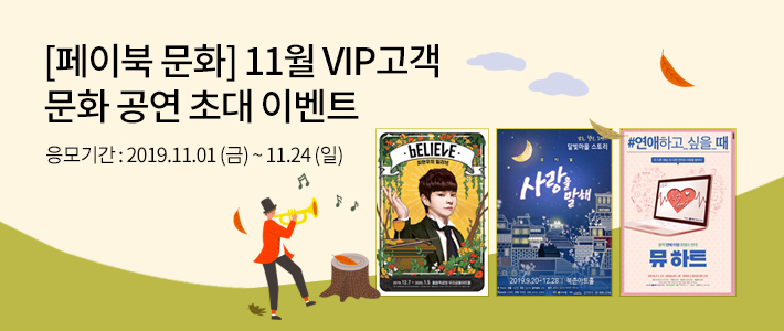 상기 수집된 정보는 <[페이북 문화] 11월 VIP고객 문화 공연 초청 이벤트> 운영목적에만 활용되며 추가적인 마케팅 목적에 활용되지 않습니다.