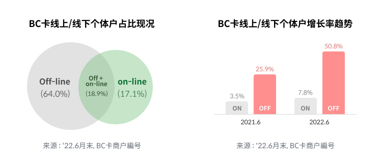 发布日期 | 2022年7月7日 (周四) 7日,BC卡(代表理事 社长 崔元硕)宣布获得了金融委员会颁发的个体户CB行业(信用信息评价)许可。 此前,BC卡在创新金融服务期间,自19年起提供“Biz Credit”服务(以下简称Biz Credit)。它可以最大化地降低信用信息不足的个体户在申请贷款时相对地被收取高利息或者被拒绝的不合理条件。 目前,“Biz Credit”适用于友利银行、Kbank等多家金融机构的贷款审核中。为正式上线该服务,BC卡于去年6月提交个体户征信业务许可的申请。 随着服务的正式推出,线上/线下个体户因申请贷款需要信用评价时,即可获得合理的信用等级。 受新冠疫情的影响,在餐饮/外卖等线上平台营业的新商家逐年增加。但是,通过PG支付很难将个体户准确的交易信息应用于信用评价中。(参考图1.) <图1.BC卡线上/线下个体户占比现况>